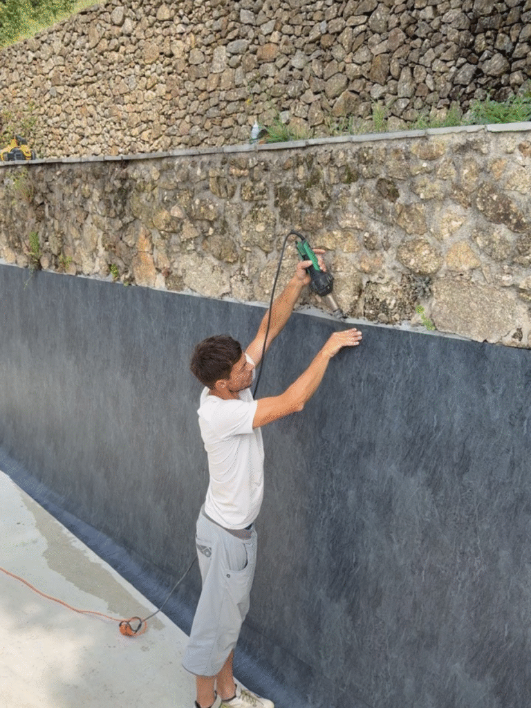 ❌ Risque de fuite à long terme. L’enduit est ce qui rend la piscine étanche, ce dernier est en prise directe sur le mur de la piscine. L’étanchéité et la bonne tenue de cet enduit est solidaire de la structure du bassin. Si la structure du bassin bouge ou micro-fissure l’enduit fera de même et toute l’étanchéité de la piscine sera remise en cause.
